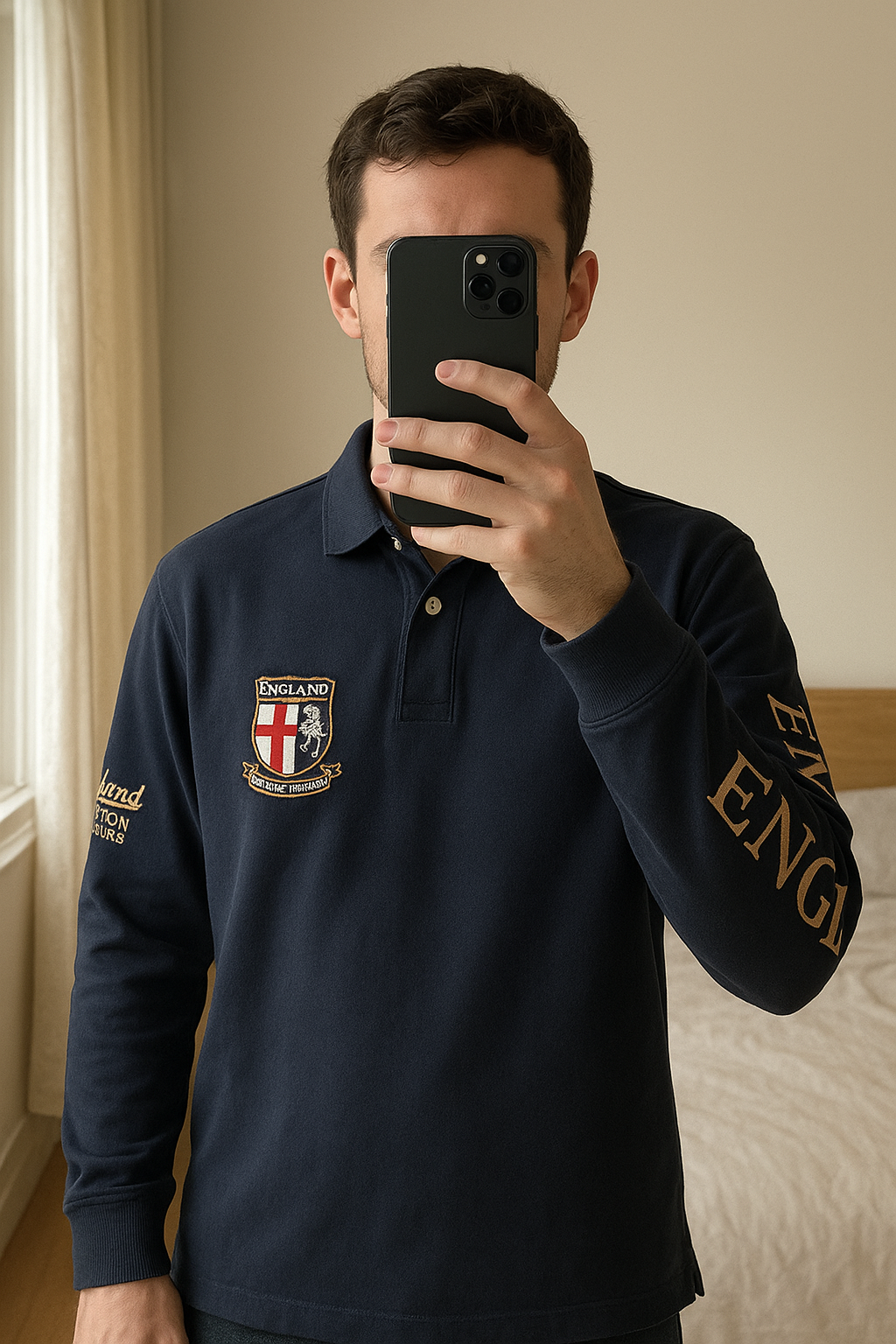 Long sleeved collared top standing straight facing the camera, in a softly lit bedroom setting, with gentle natural light filtering through a window.