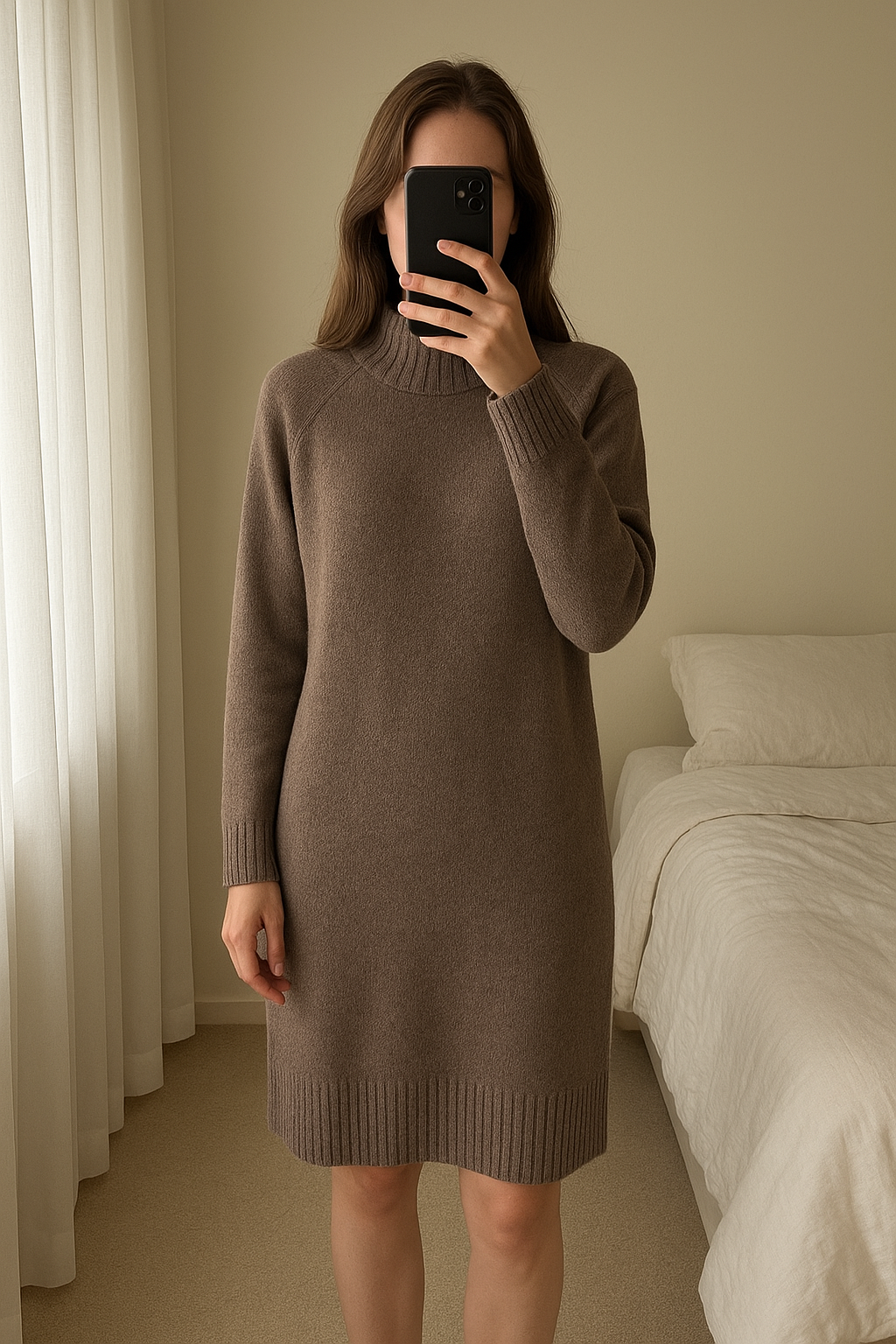 Long sleeved jumper dress - size M standing straight facing the camera, in a softly lit bedroom setting, with gentle natural light filtering through a window.
