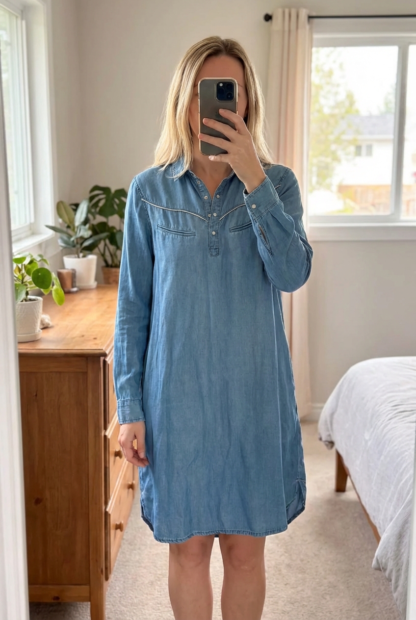 Longue Robe chemise debout, face à la caméra, dans une chambre à la lumière douce, avec une lumière naturelle filtrant par la fenêtre.
