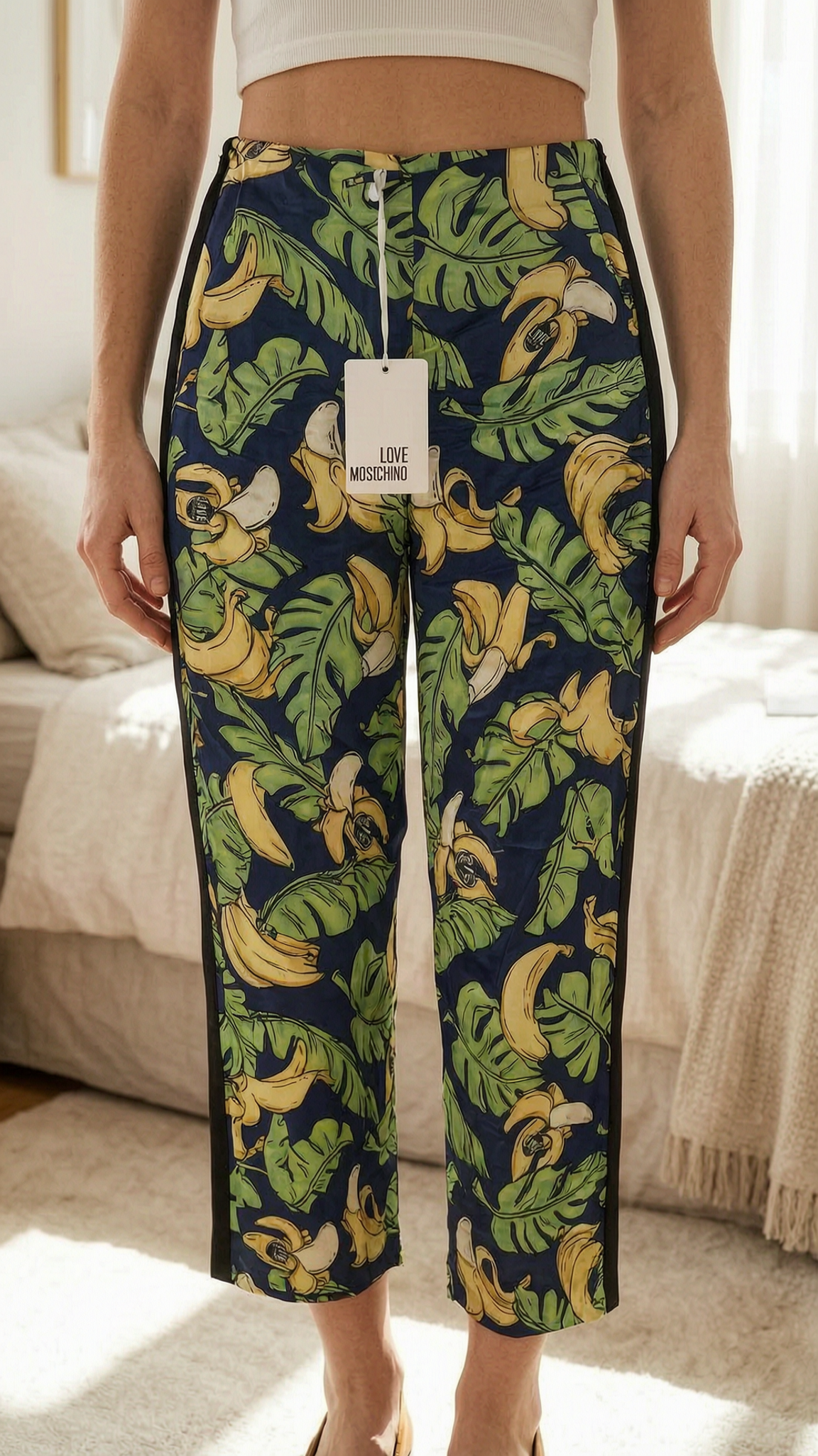 Love Moschino Banana Print Hose aufrecht stehend, der Kamera zugewandt, in einem sanft beleuchteten Schlafzimmer, mit natürlichem Licht, das durch ein Fenster fällt.