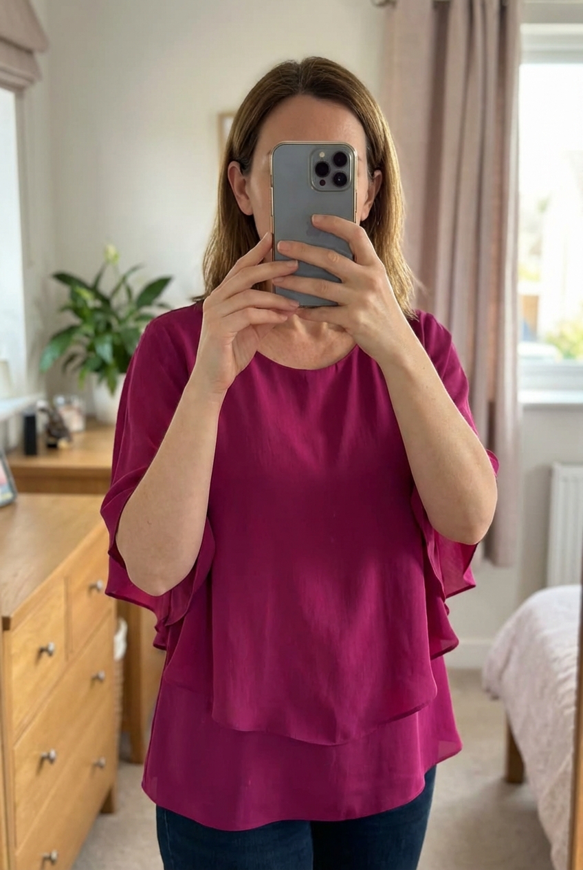 M & Co chiffon top standing straight facing the camera, in a softly lit bedroom setting, with gentle natural light filtering through a window.