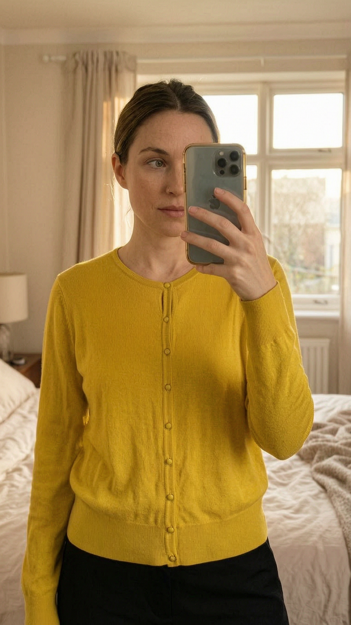 M&S Collection Mustard button up cardigon - size 14 standing straight facing the camera, in a softly lit bedroom setting, with gentle natural light filtering through a window.