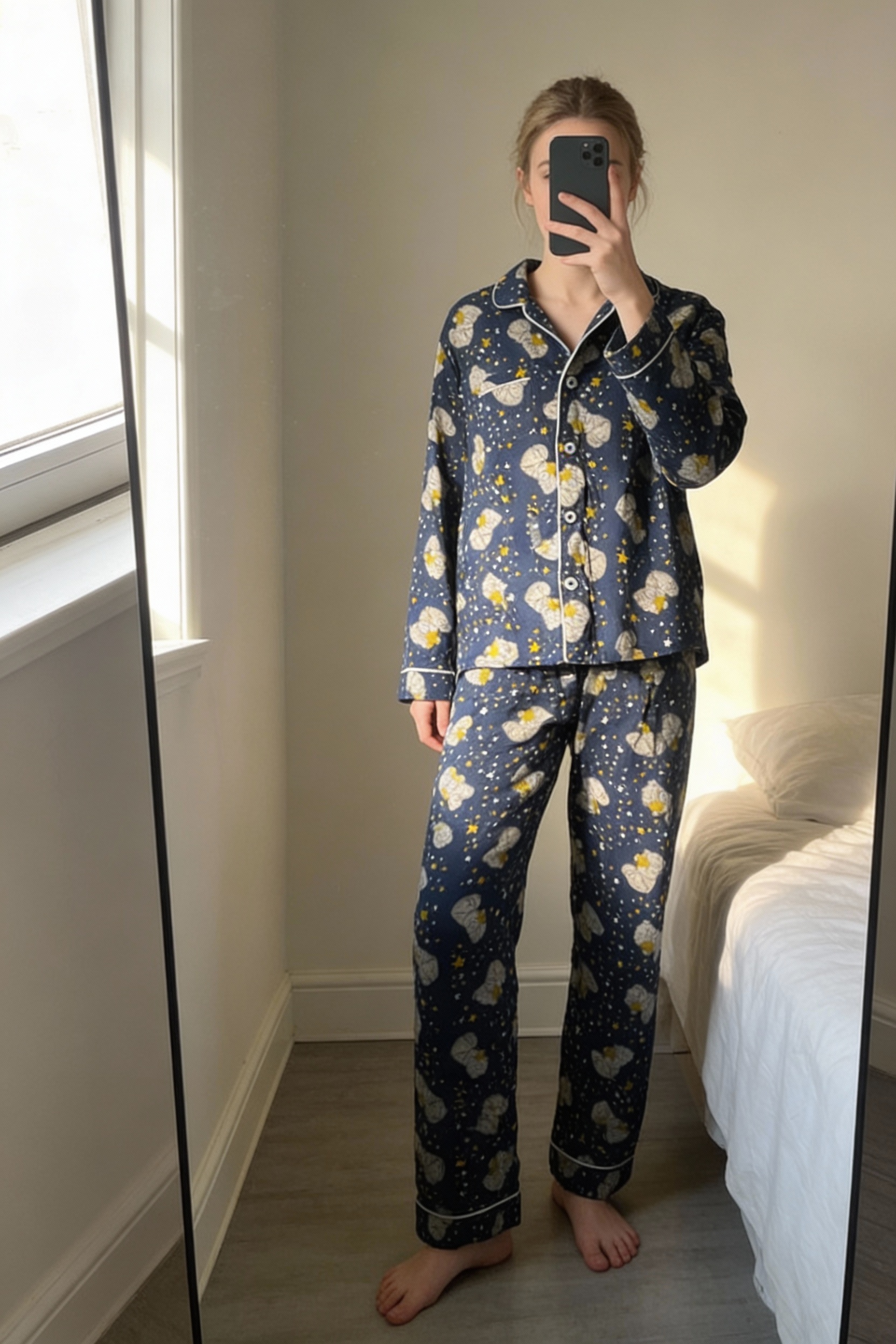 M&S Me to You Navy Brushed Cotton Pyjamas Age 5-6 Years standing straight facing the camera, in a softly lit bedroom setting, with gentle natural light filtering through a window.