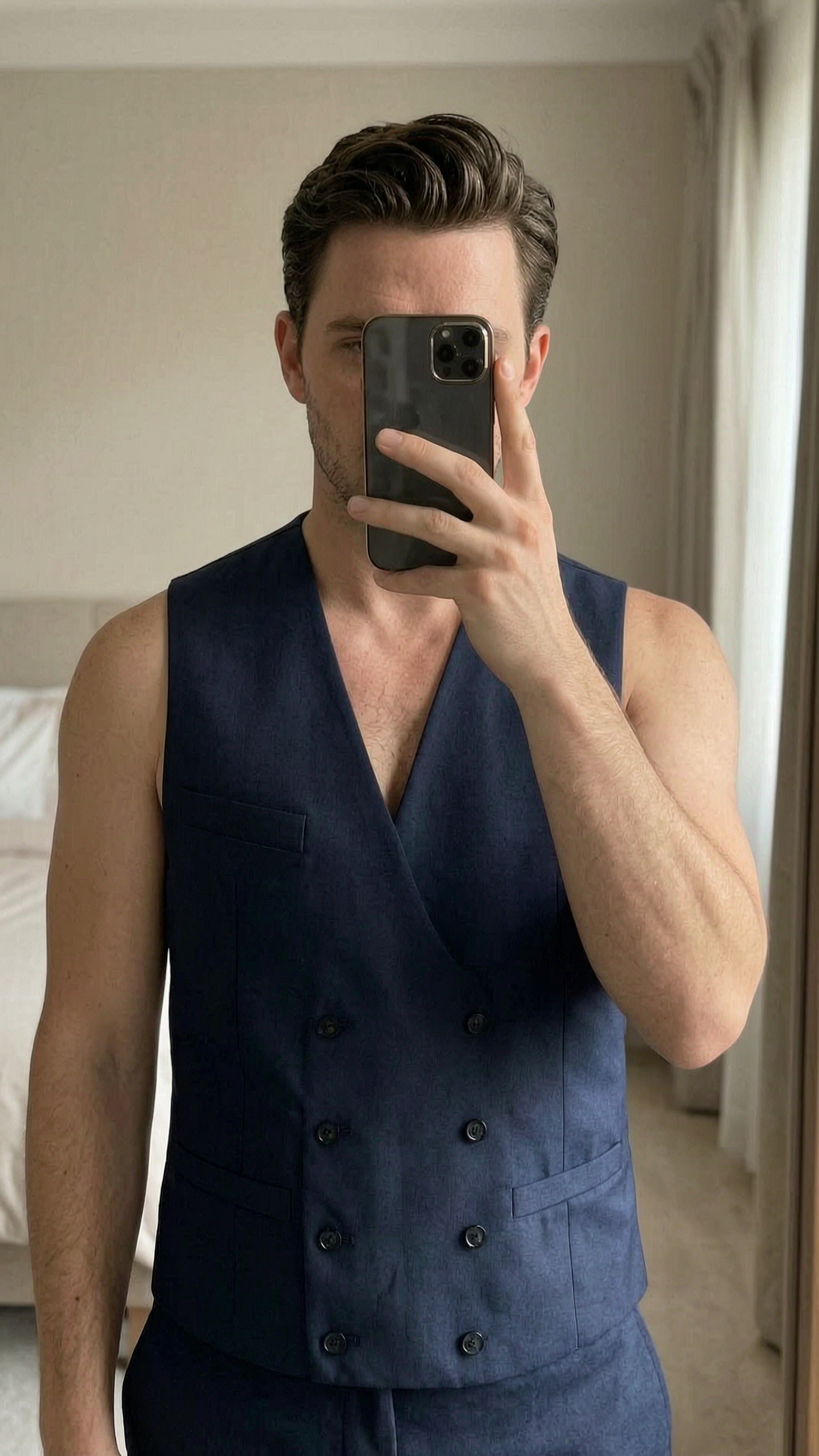 M&S Navy Double-Breasted Waistcoat | Smart Formal | Size 38R standing straight facing the camera, in a softly lit bedroom setting, with gentle natural light filtering through a window.