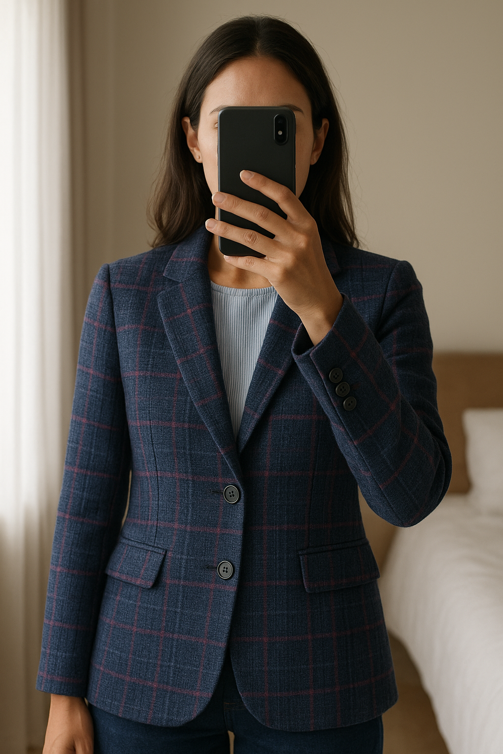 M&S Per Una pure wool hacking blazer size 6 standing straight facing the camera, in a softly lit bedroom setting, with gentle natural light filtering through a window.