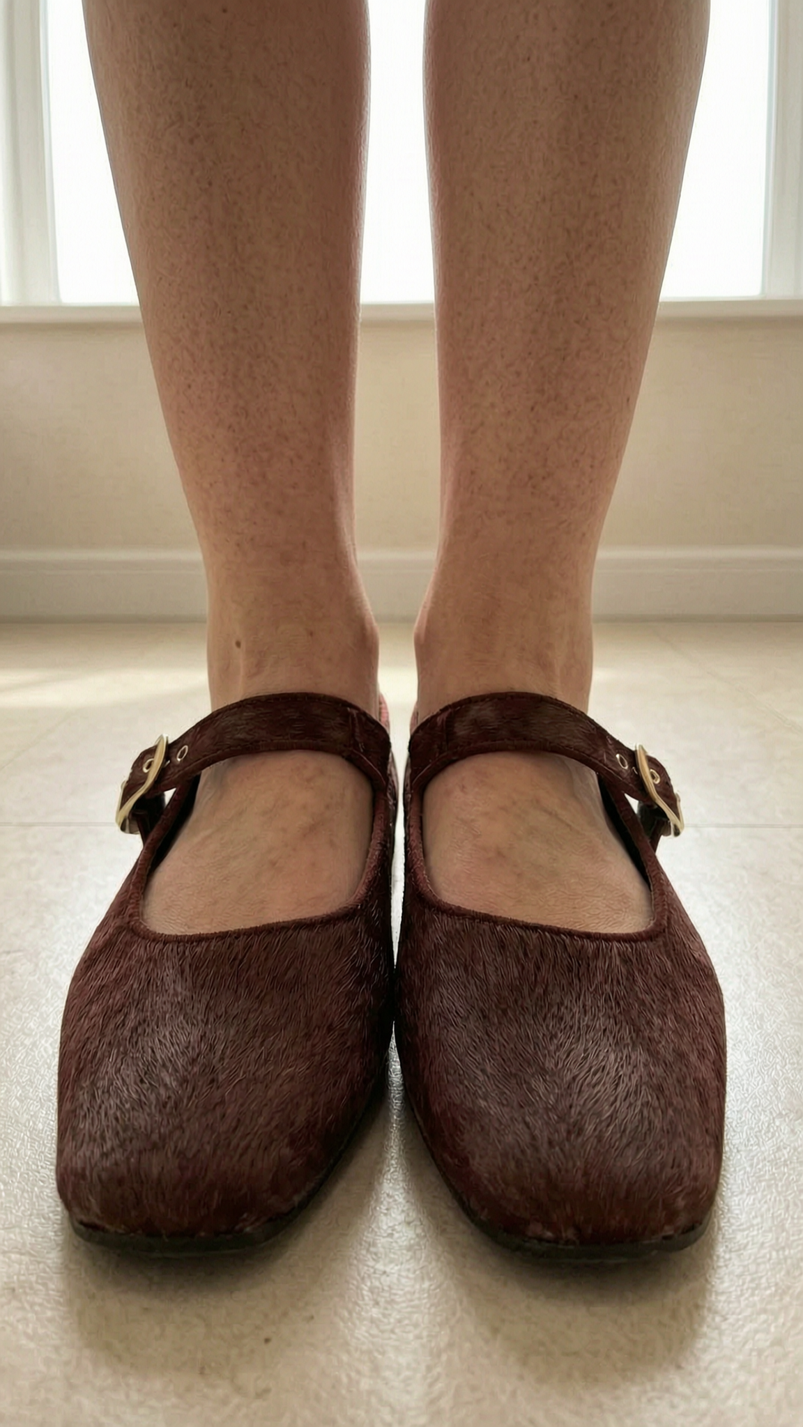 M&S Pony Burgundy Flats Size 7 standing straight facing the camera, in a softly lit bedroom setting, with gentle natural light filtering through a window.
