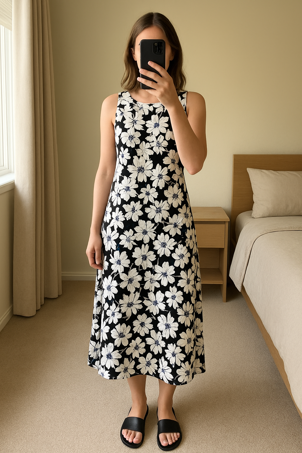 M&S summer dress navy and white size 14 regular standing straight facing the camera, in a softly lit bedroom setting, with gentle natural light filtering through a window.