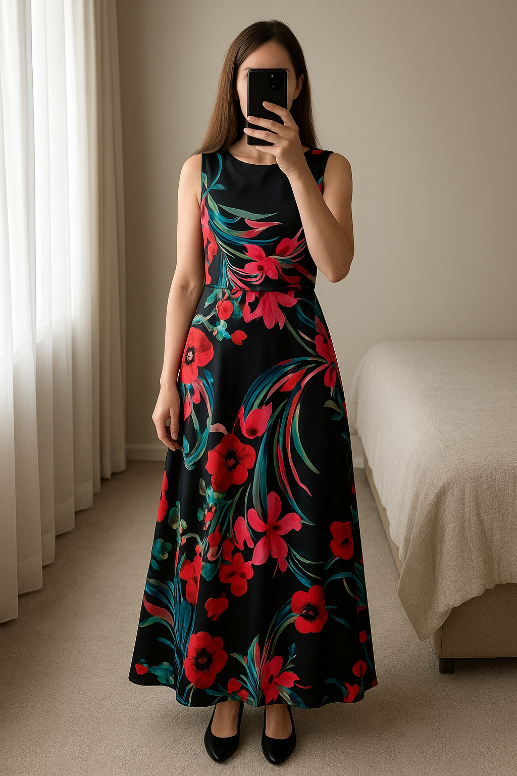 M&S top and skirt size 16 standing straight facing the camera, in a softly lit bedroom setting, with gentle natural light filtering through a window.
