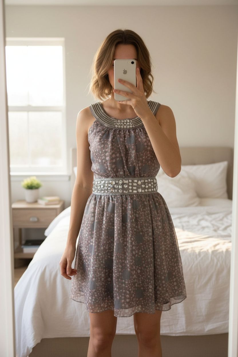 A person in madam Rage mauve y2k deadstock dress size 12 standing straight facing the camera, with a slim body type, in a softly lit bedroom setting, with gentle natural light filtering through a window.