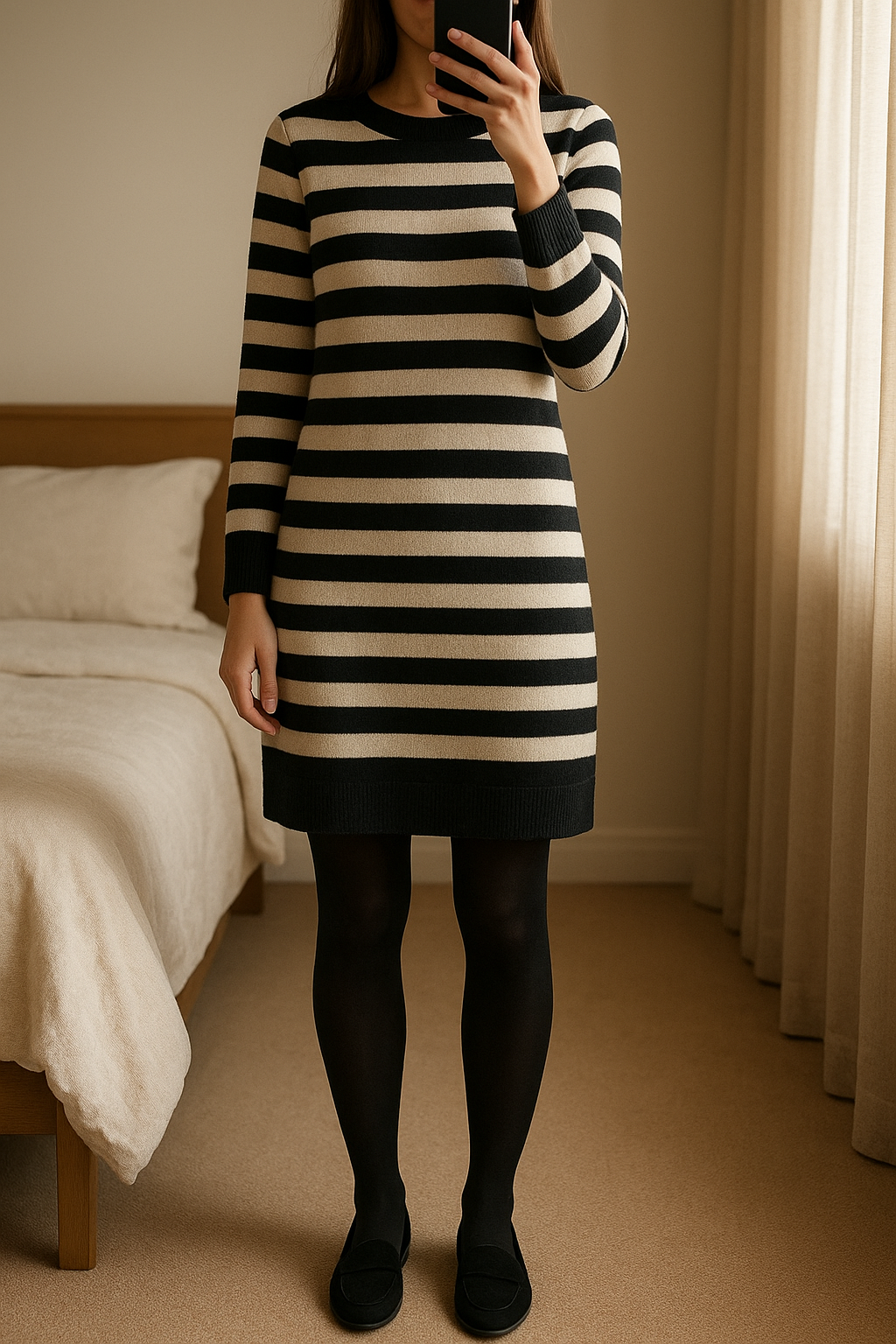 Maglia lunga / Vestito a righe bianco e nero in piedi, rivolto verso la fotocamera, in una camera da letto con luce soffusa e luce naturale che filtra dalla finestra.