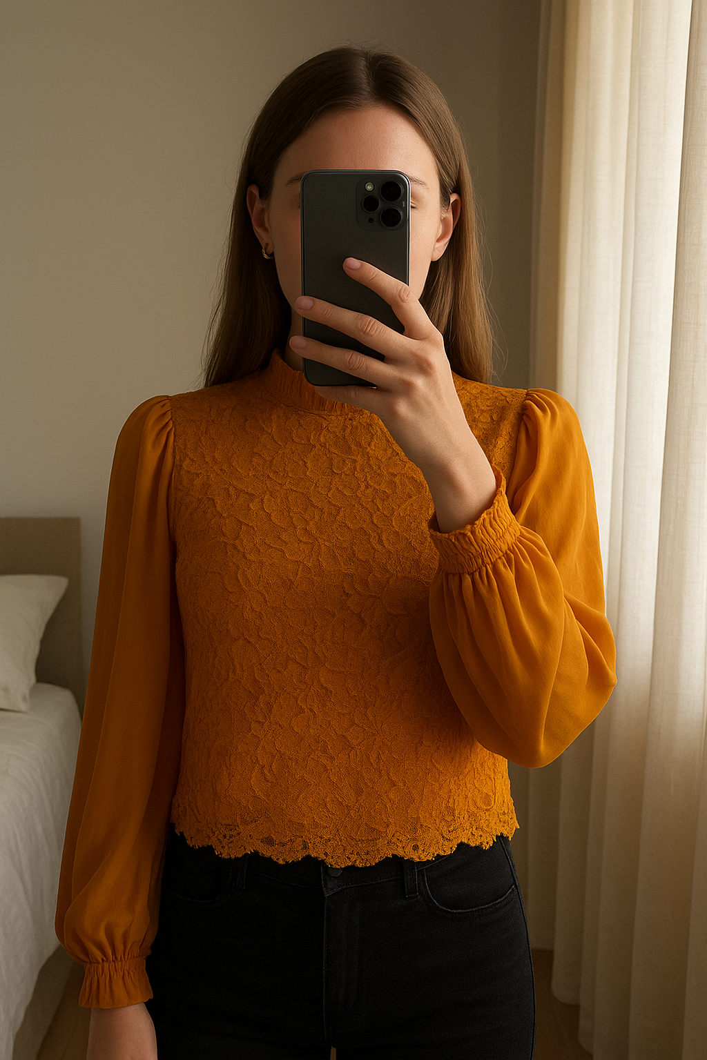 Magnifique blousse taille S debout, face à la caméra, dans une chambre à la lumière douce, avec une lumière naturelle filtrant par la fenêtre.