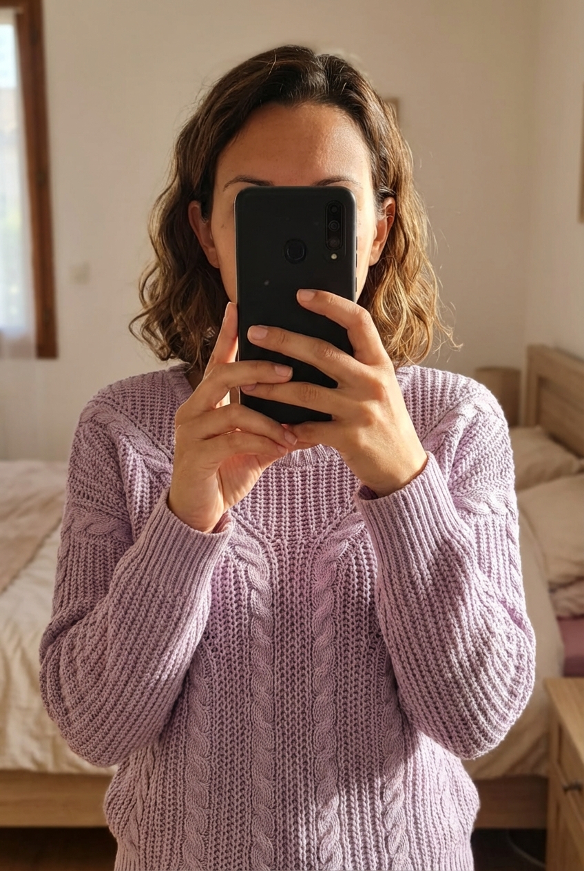 Une personne en Magnifique pull ajouré couleur lilas – doux et tendance debout, face à la caméra, dans une chambre à la lumière douce, avec une lumière naturelle filtrant par la fenêtre.