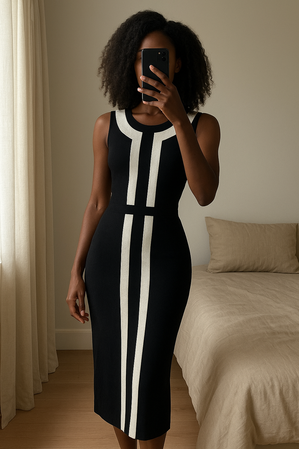 Une personne en Magnifique Robe Business Sans Manches T42 cambrant légèrement le dos pour une pose dynamique, dans une chambre à la lumière douce, avec une lumière naturelle filtrant par la fenêtre.