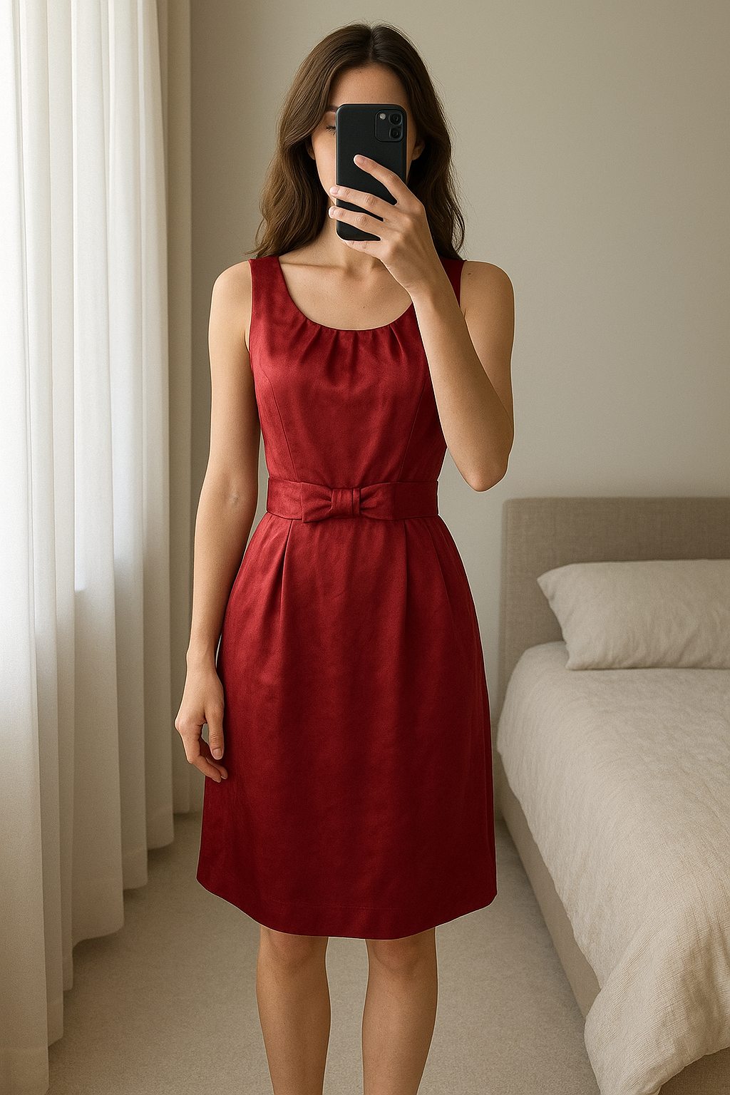 Magnifique robe taille 38 couleur rouille 🍒 debout, face à la caméra, dans une chambre à la lumière douce, avec une lumière naturelle filtrant par la fenêtre.
