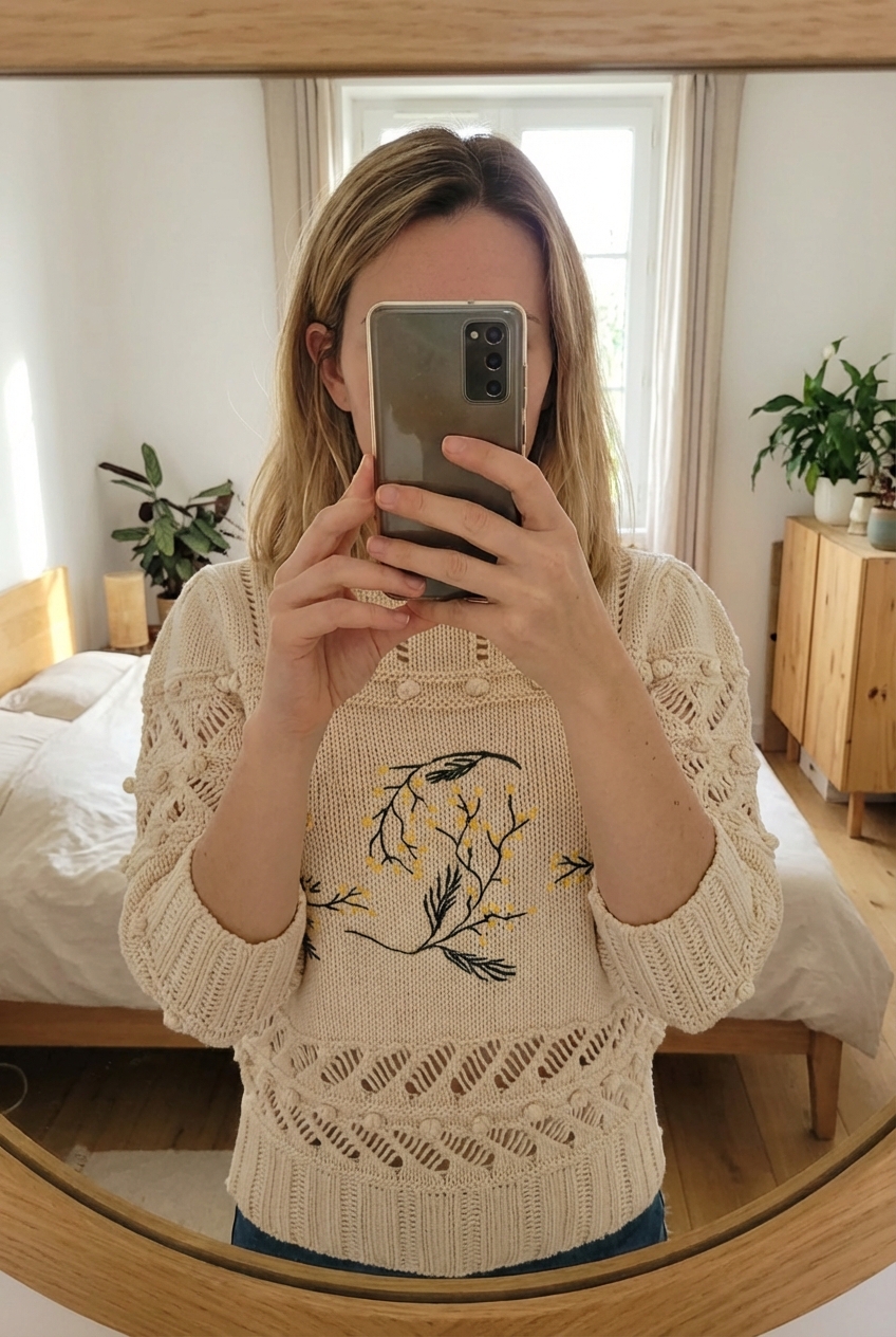 Maille pull Claudie pierlot T38 neuf debout, face à la caméra, dans une chambre à la lumière douce, avec une lumière naturelle filtrant par la fenêtre.