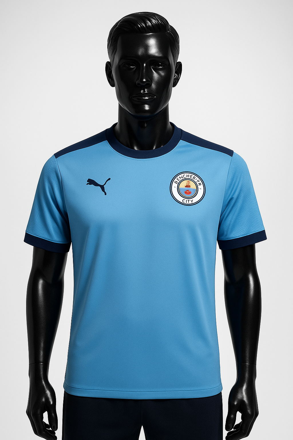 un mannequin noir brillant en plastique, sans traits du visage en Maillot d’entraînement Manchester City - Puma - Taille XL debout, face à la caméra, dans un studio photo épuré avec fond blanc et éclairage doux.