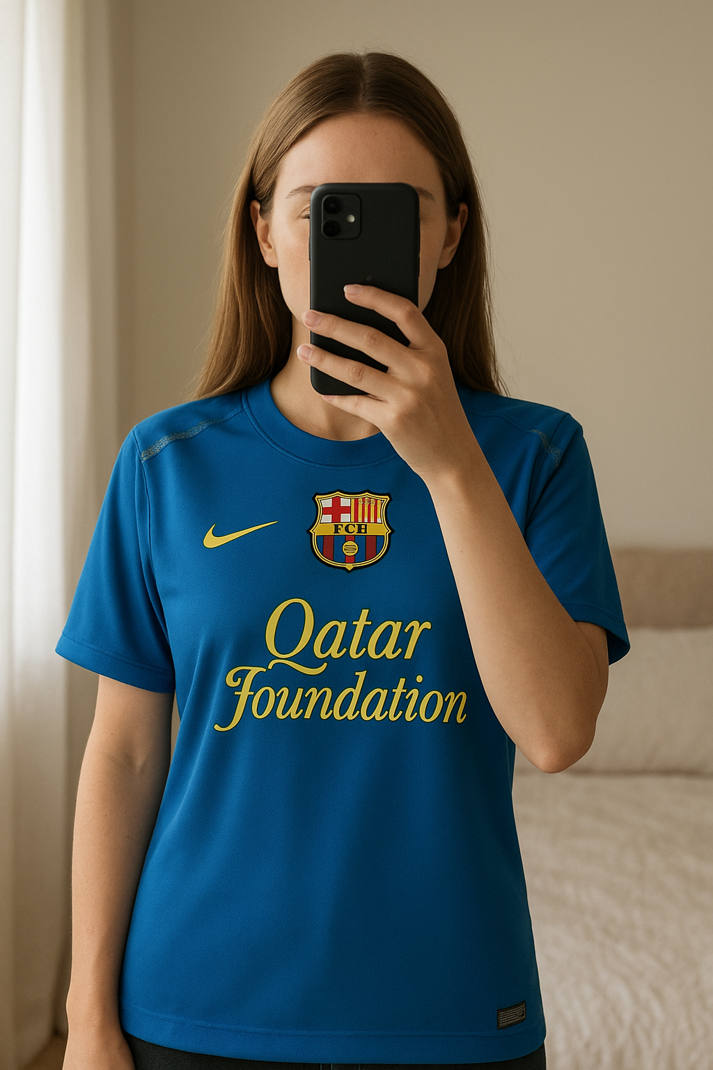 Maillot fc Barcelone entraînement 2011-2012 L debout, face à la caméra, dans une chambre à la lumière douce, avec une lumière naturelle filtrant par la fenêtre.