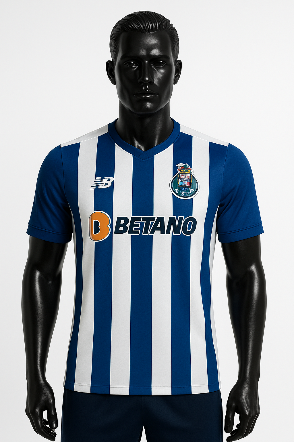 un mannequin noir brillant en plastique, sans traits du visage en Maillot FC Porto - Officiel et Authenthique - New Balance - Taille XL debout, face à la caméra, dans un studio photo épuré avec fond blanc et éclairage doux.