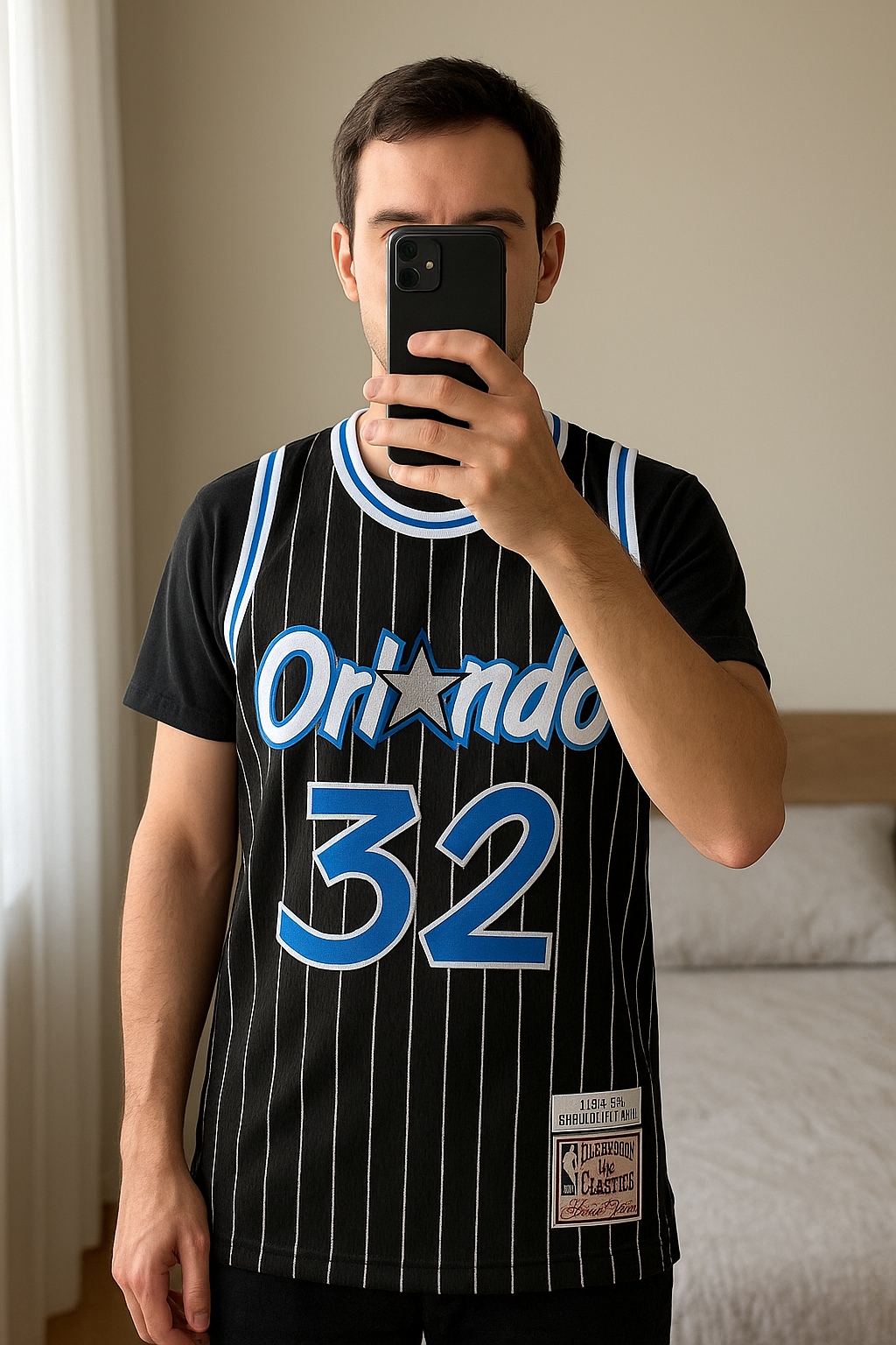 Maillot Rétro S.O´Neal - Magic debout, face à la caméra, dans une chambre à la lumière douce, avec une lumière naturelle filtrant par la fenêtre.