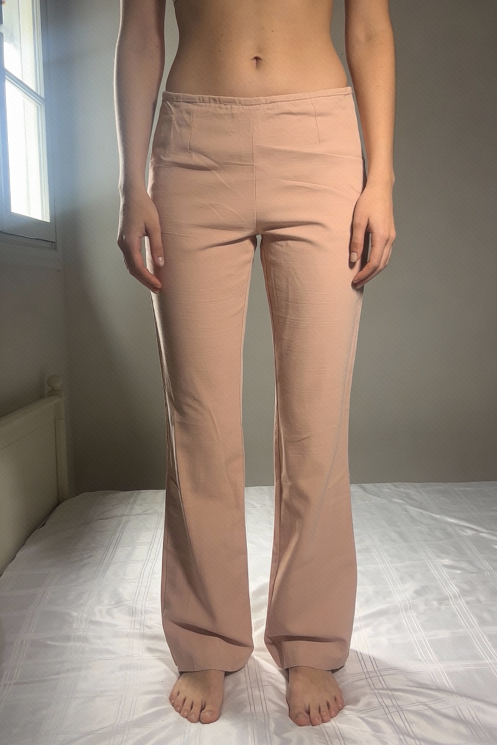 Mango Baby Pink Womens Tailored Trousers – Size 8 Wide Leg Smart Work Pants standing straight facing the camera, in a softly lit bedroom setting, with gentle natural light filtering through a window.