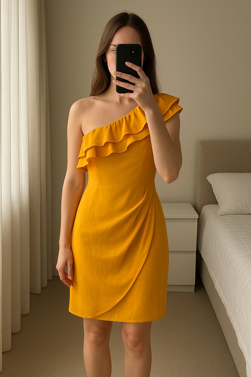 Mango Orange One-Shoulder Ruffle Dress – Size XS (8) standing straight facing the camera, in a softly lit bedroom setting, with gentle natural light filtering through a window.