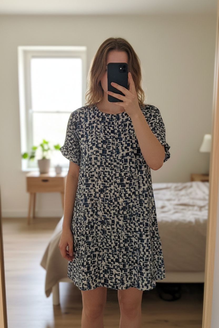 Mango robe taille M debout, face à la caméra, dans une chambre à la lumière douce, avec une lumière naturelle filtrant par la fenêtre.