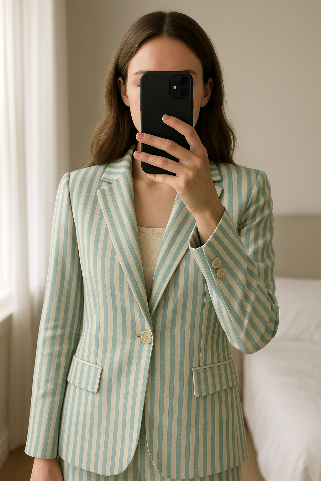 Mango Striped Blazer – Mint Green & White | Size S | New with Tags standing straight facing the camera, in a softly lit bedroom setting, with gentle natural light filtering through a window.