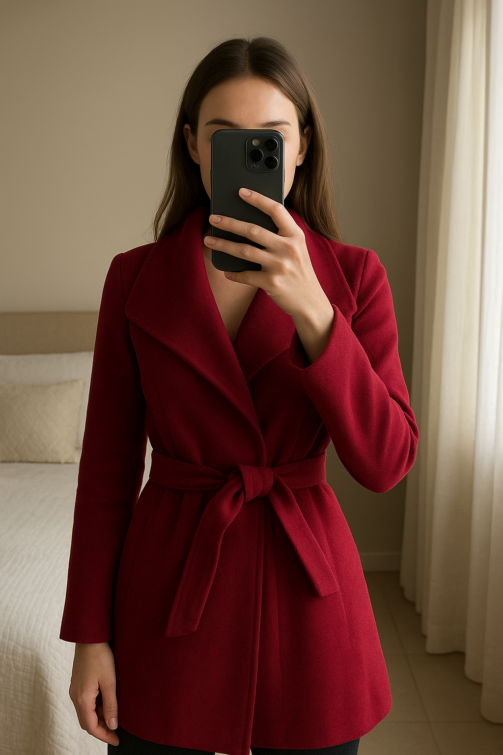 Manteau bordeau debout, face à la caméra, dans une chambre à la lumière douce, avec une lumière naturelle filtrant par la fenêtre.