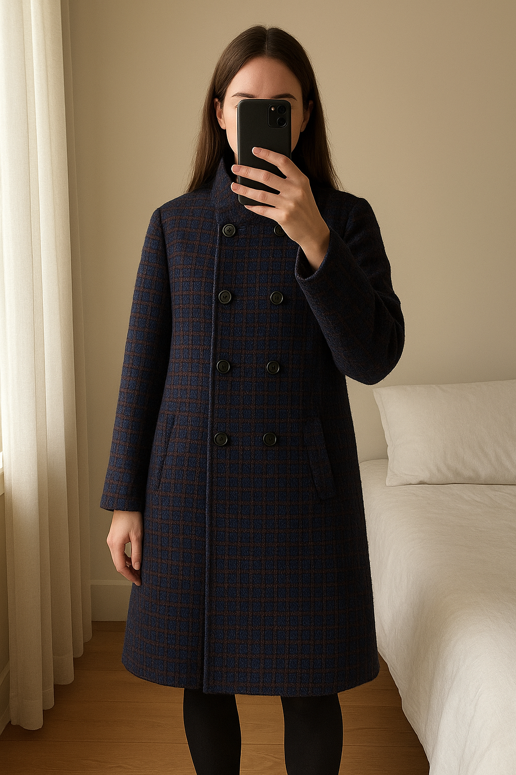 Manteau Caroll debout, face à la caméra, dans une chambre à la lumière douce, avec une lumière naturelle filtrant par la fenêtre.