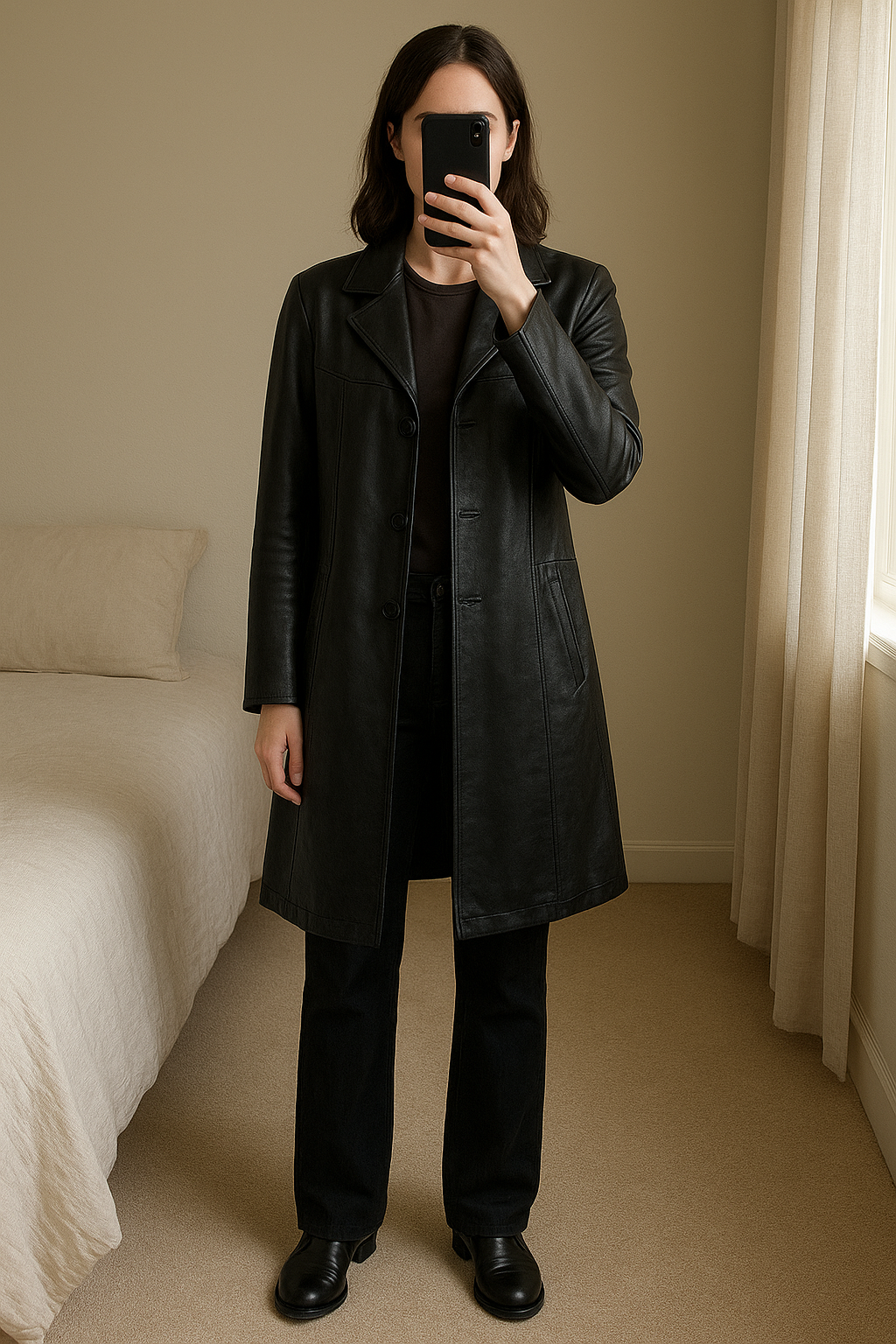 Manteau en cuir véritable debout, face à la caméra, dans une chambre à la lumière douce, avec une lumière naturelle filtrant par la fenêtre.