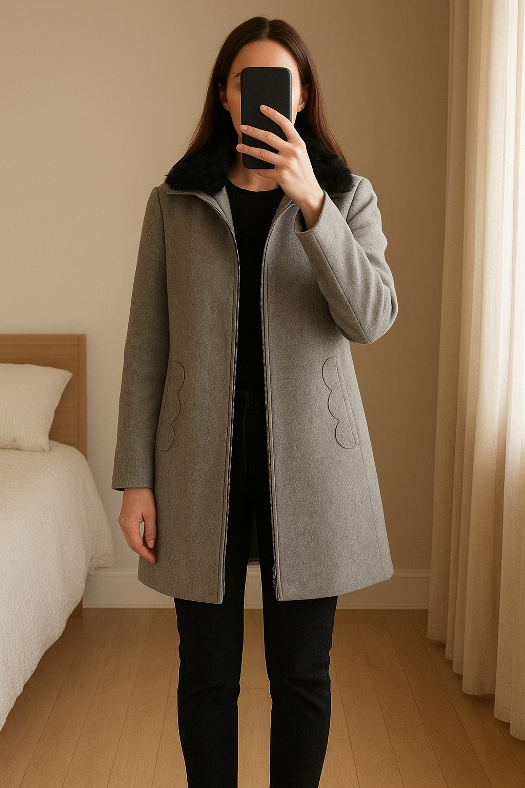 Manteau femme debout, face à la caméra, dans une chambre à la lumière douce, avec une lumière naturelle filtrant par la fenêtre.