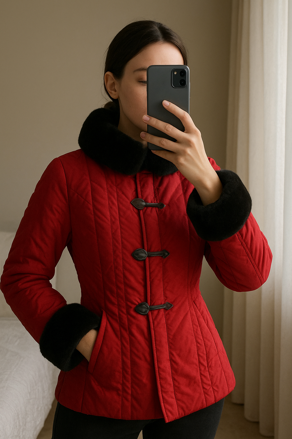 Une personne en Manteau femme rouge style slave cambrant légèrement le dos pour une pose dynamique, dans une chambre à la lumière douce, avec une lumière naturelle filtrant par la fenêtre.