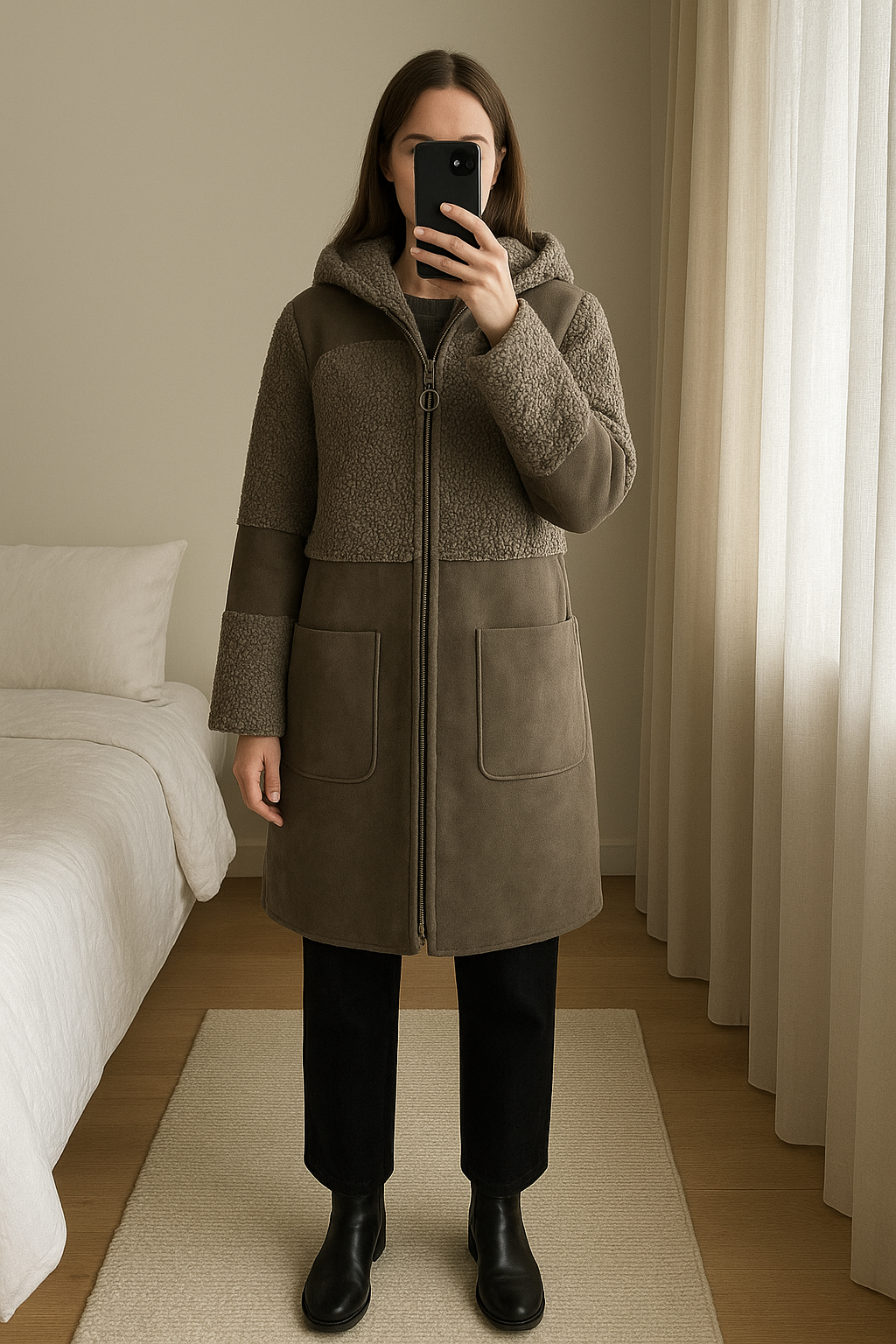 Manteau gris/taupe moumoute Bimba y Lola s debout, face à la caméra, dans une chambre à la lumière douce, avec une lumière naturelle filtrant par la fenêtre.