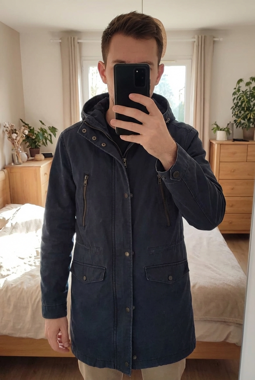 Manteau Jules bleue Marine à capuche debout, face à la caméra, dans une chambre à la lumière douce, avec une lumière naturelle filtrant par la fenêtre.