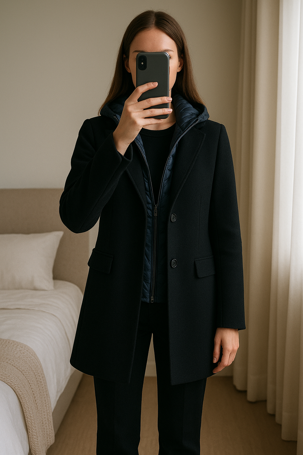 Manteau laine Caroll debout, face à la caméra, dans une chambre à la lumière douce, avec une lumière naturelle filtrant par la fenêtre.