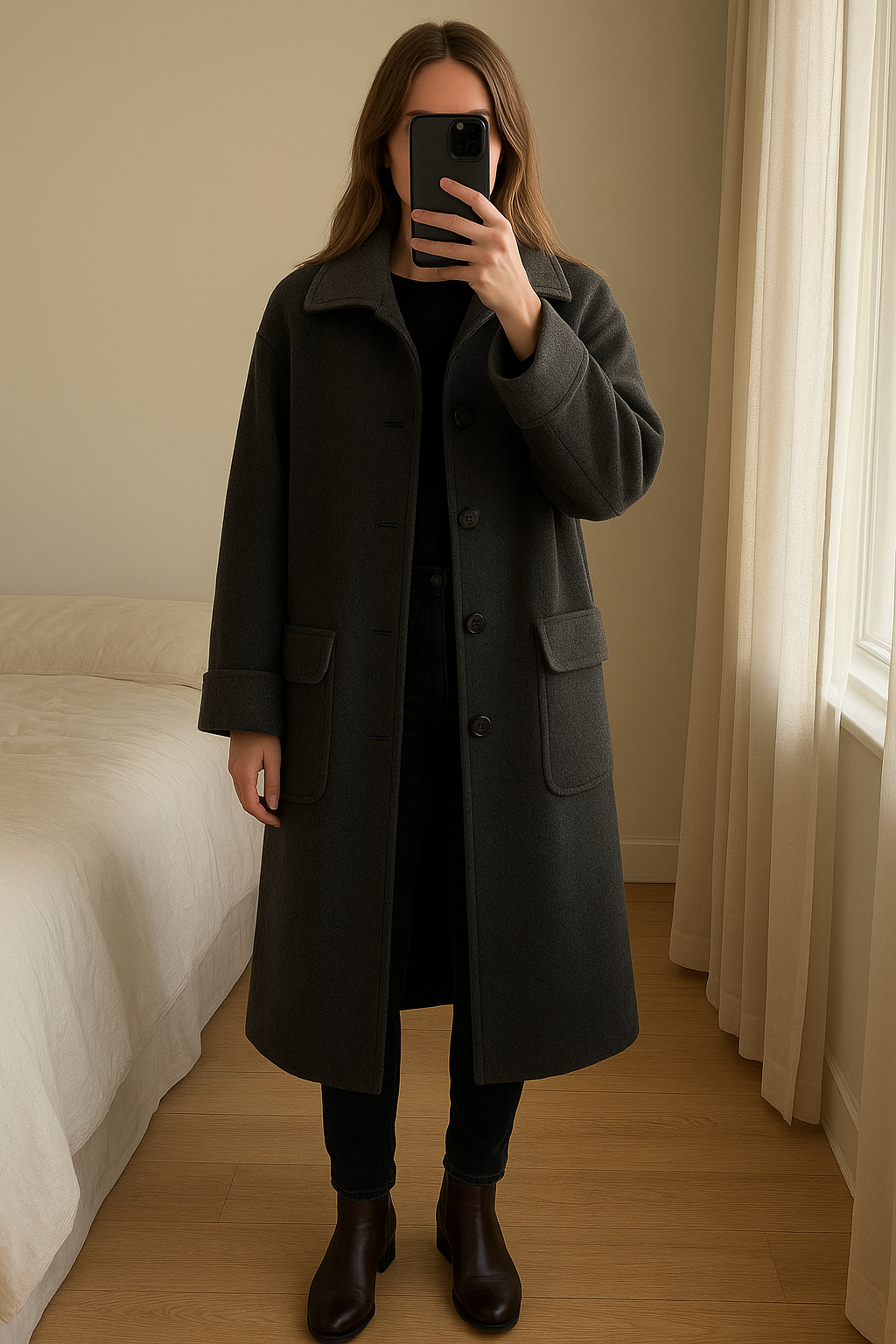 Manteau laine Devernois debout, face à la caméra, dans une chambre à la lumière douce, avec une lumière naturelle filtrant par la fenêtre.