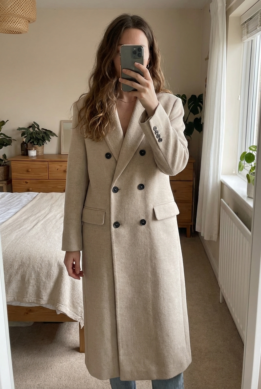 Manteau laine oversize zara XS debout, face à la caméra, dans une chambre à la lumière douce, avec une lumière naturelle filtrant par la fenêtre.