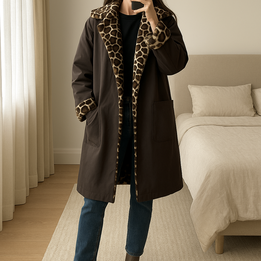Manteau long debout, face à la caméra, dans une chambre à la lumière douce, avec une lumière naturelle filtrant par la fenêtre.