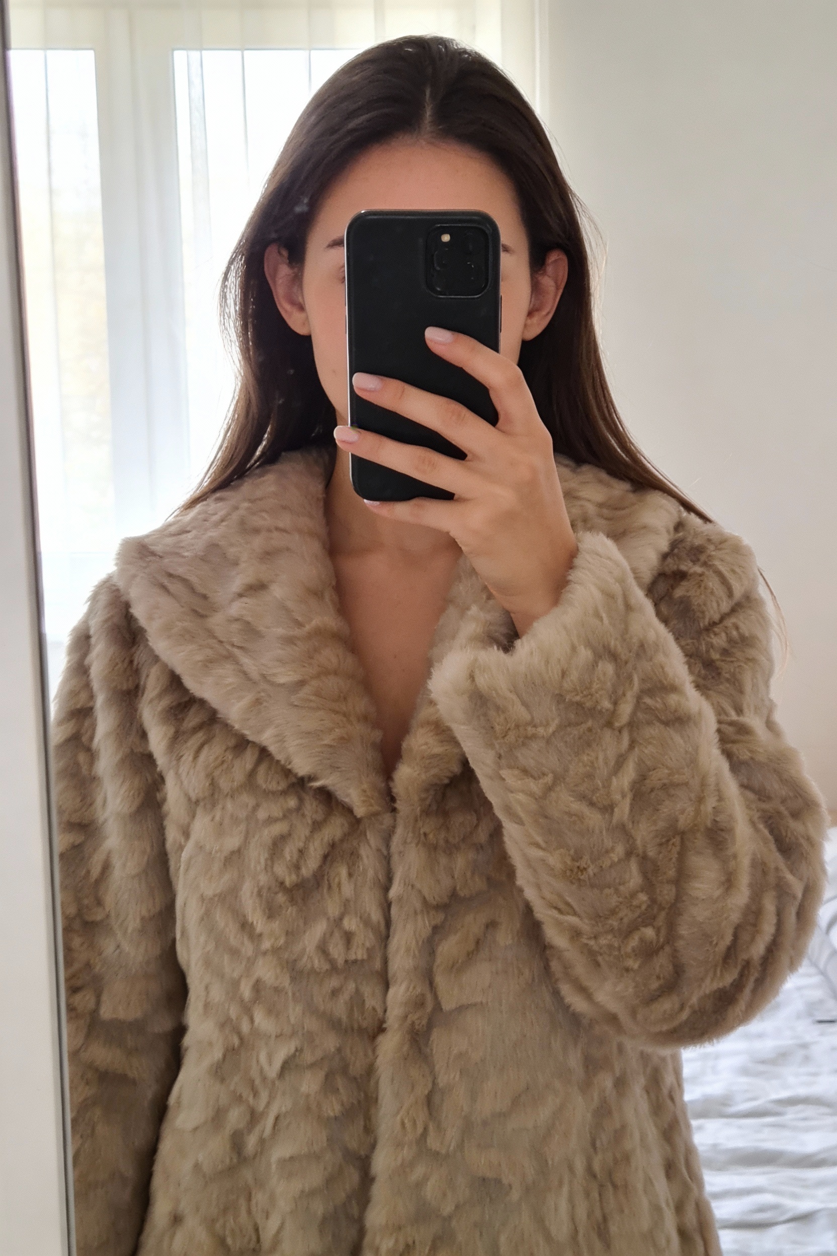 Manteau Morgan T42 debout, face à la caméra, dans une chambre à la lumière douce, avec une lumière naturelle filtrant par la fenêtre.