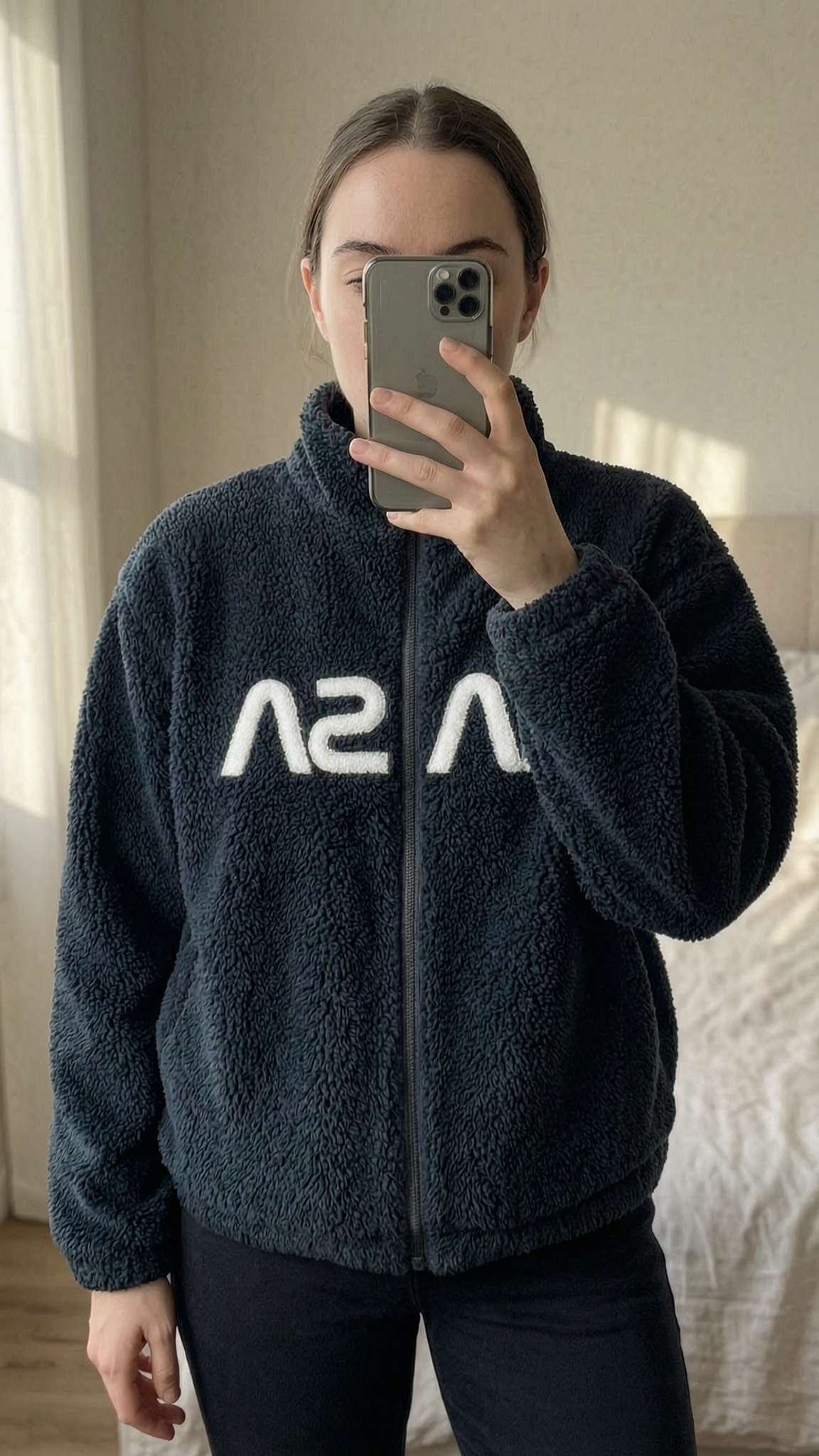 Manteau nasa debout, face à la caméra, dans une chambre à la lumière douce, avec une lumière naturelle filtrant par la fenêtre.