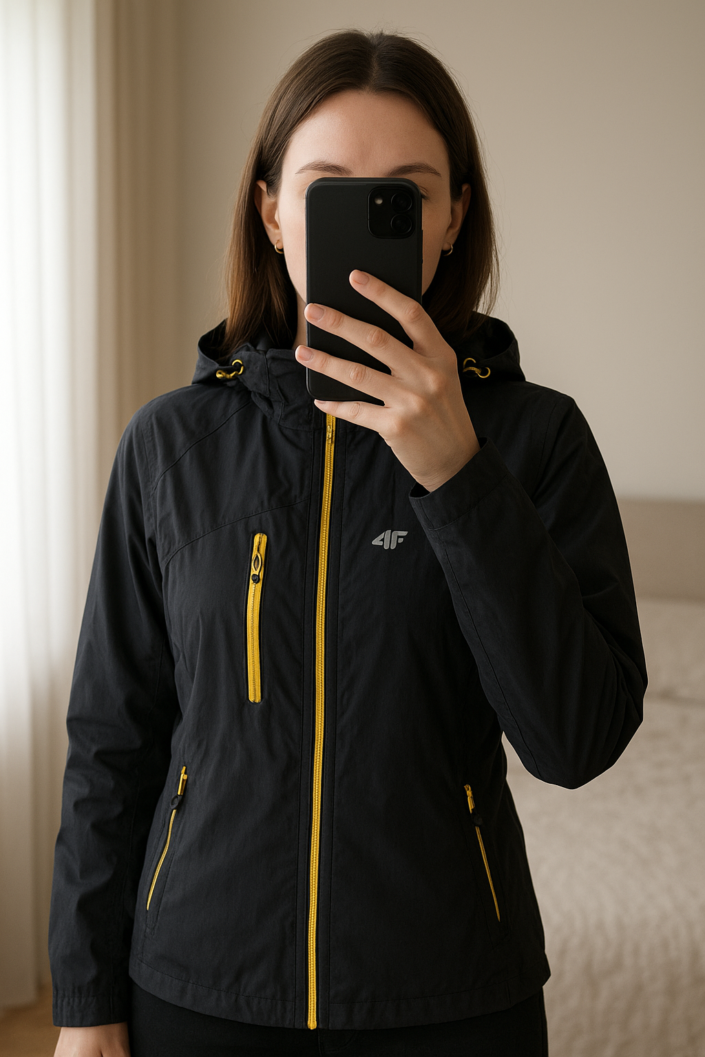 Manteau noir ski 4F debout, face à la caméra, dans une chambre à la lumière douce, avec une lumière naturelle filtrant par la fenêtre.