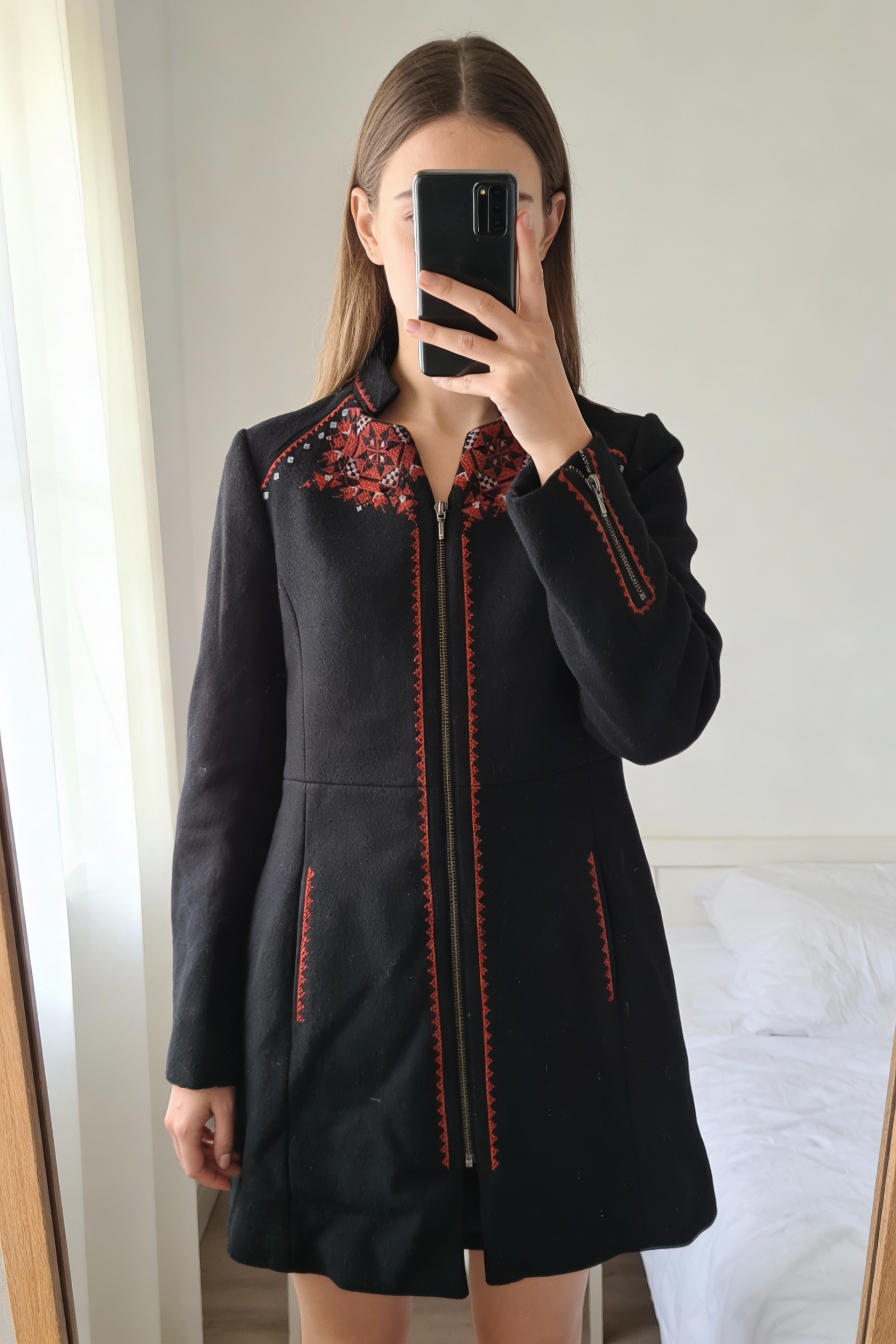 Manteau Promod noir brodé rouge debout, face à la caméra, dans une chambre à la lumière douce, avec une lumière naturelle filtrant par la fenêtre.