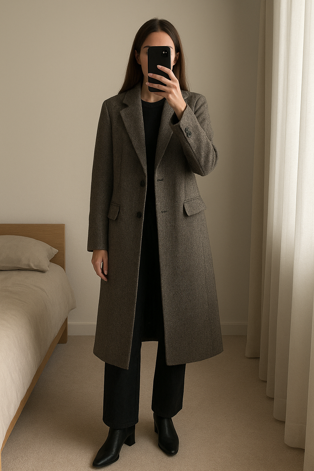 Manteau pull&bear très bon état taille XS debout, face à la caméra, dans une chambre à la lumière douce, avec une lumière naturelle filtrant par la fenêtre.