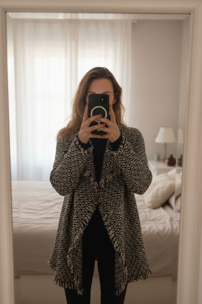 Manteau Red Soul pied de poule T36 debout, face à la caméra, dans une chambre à la lumière douce, avec une lumière naturelle filtrant par la fenêtre.