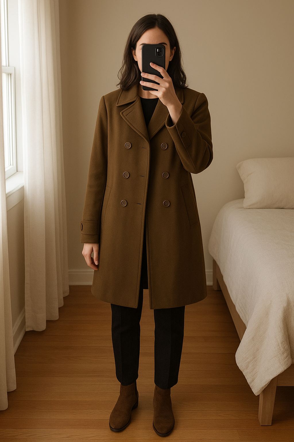 Manteau-Trench Comptoir des Cotonniers debout, face à la caméra, dans une chambre à la lumière douce, avec une lumière naturelle filtrant par la fenêtre.