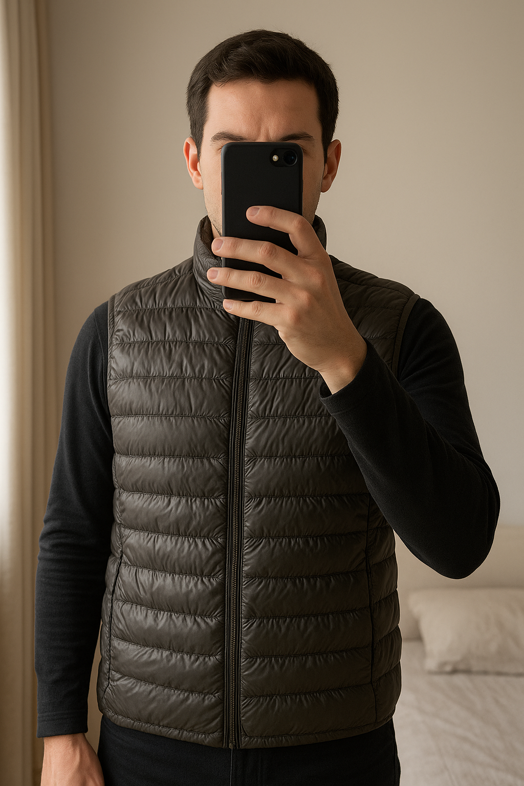 Manteau ultraléger sans manches homme debout, face à la caméra, dans une chambre à la lumière douce, avec une lumière naturelle filtrant par la fenêtre.
