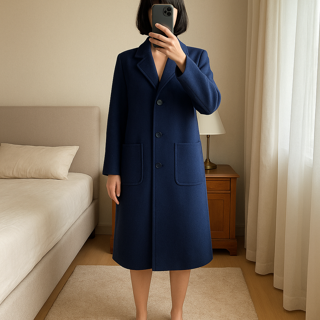 Manteau vintage Weill Paris - 1988 - T38 / M – Bleu profond – Surcoutures élégantes – Excellent état debout, face à la caméra, dans une chambre à la lumière douce, avec une lumière naturelle filtrant par la fenêtre.