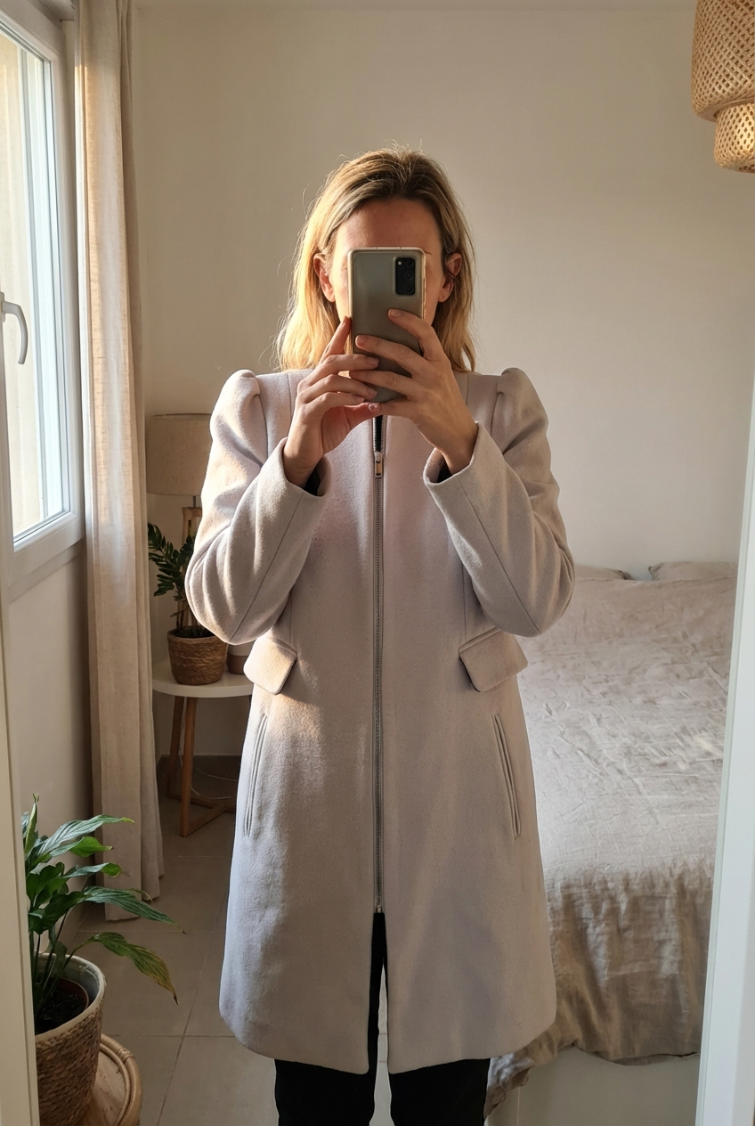 Manteau Zara debout, face à la caméra, dans une chambre à la lumière douce, avec une lumière naturelle filtrant par la fenêtre.