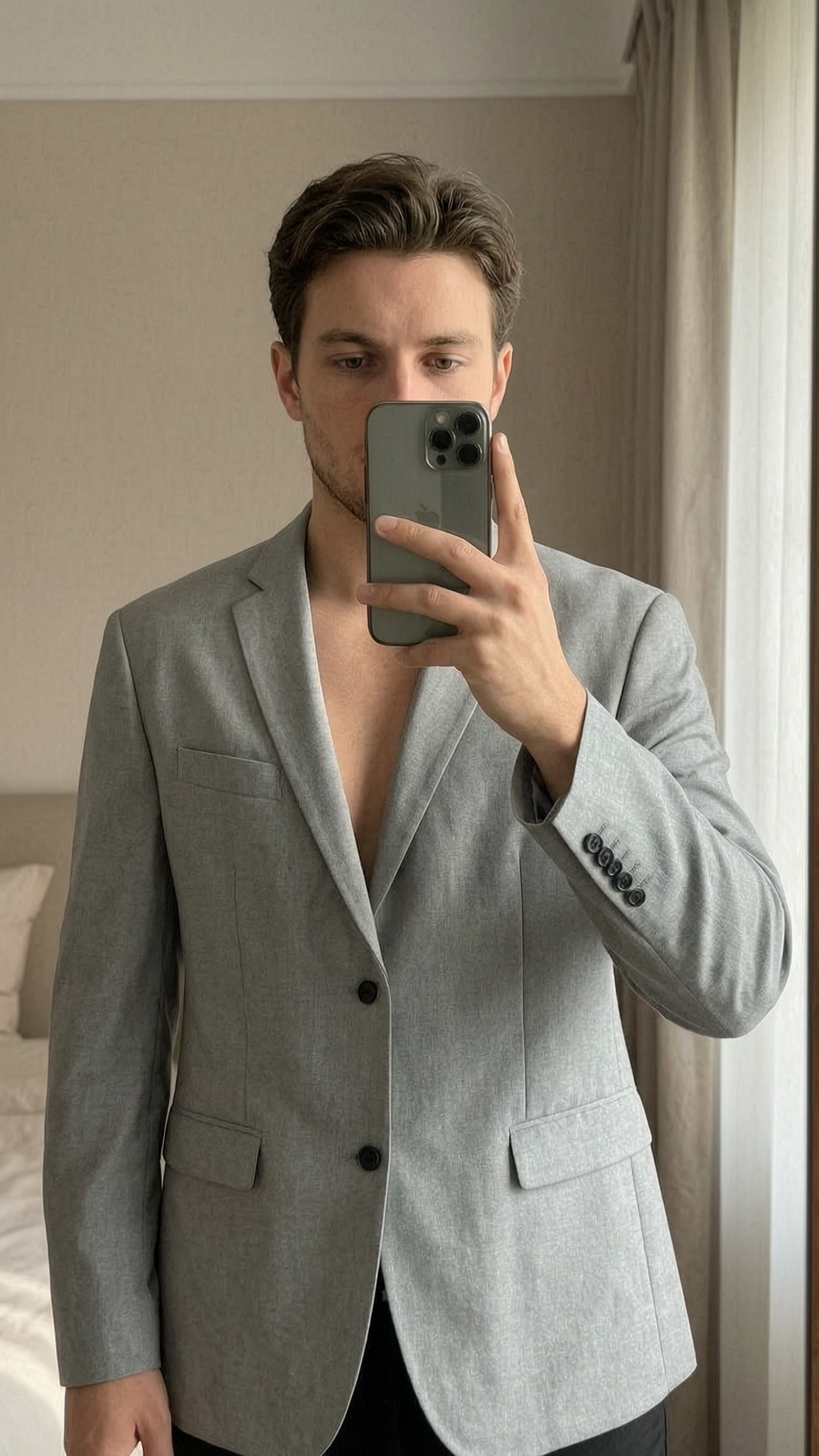 Men's Grey Zara Textured Blazer standing straight facing the camera, in a softly lit bedroom setting, with gentle natural light filtering through a window.