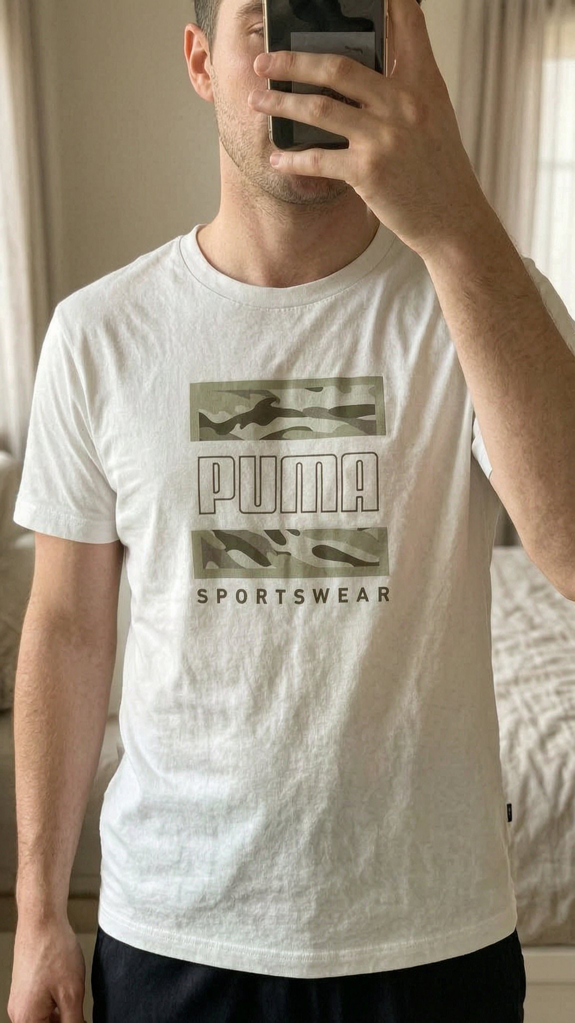 A person in Men’s puma casual short sleeved t-shirt size small standing straight facing the camera, in a softly lit bedroom setting, with gentle natural light filtering through a window.